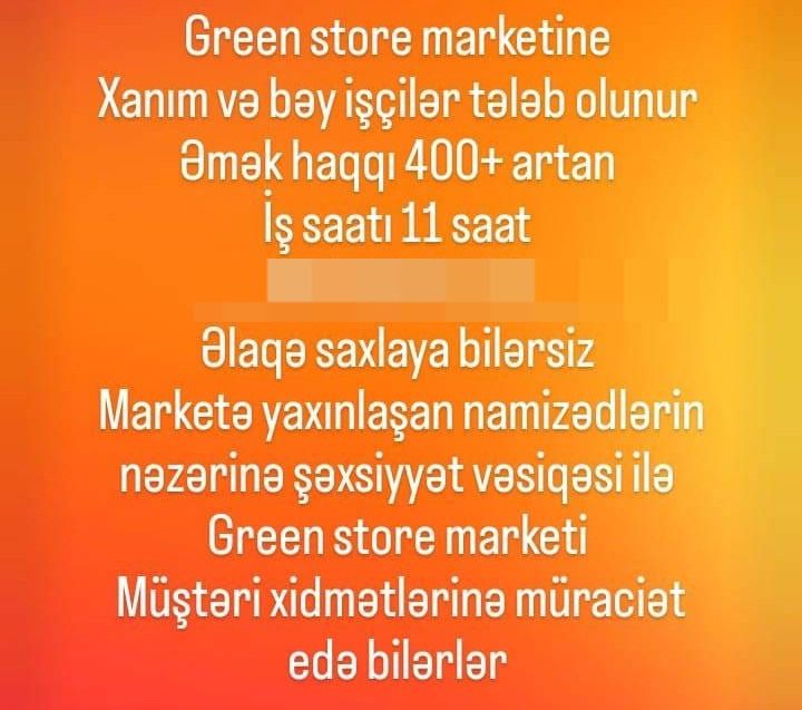 “Mağazada müştəri xidmətlərinə yaxınlaşa bilərsiniz. Elanda yazdığımız kimi iş vaxtı 11 saat, əmək haqqı 400 manatdır. Ayda iki dəfə istirahət günü təklif olunur”.
