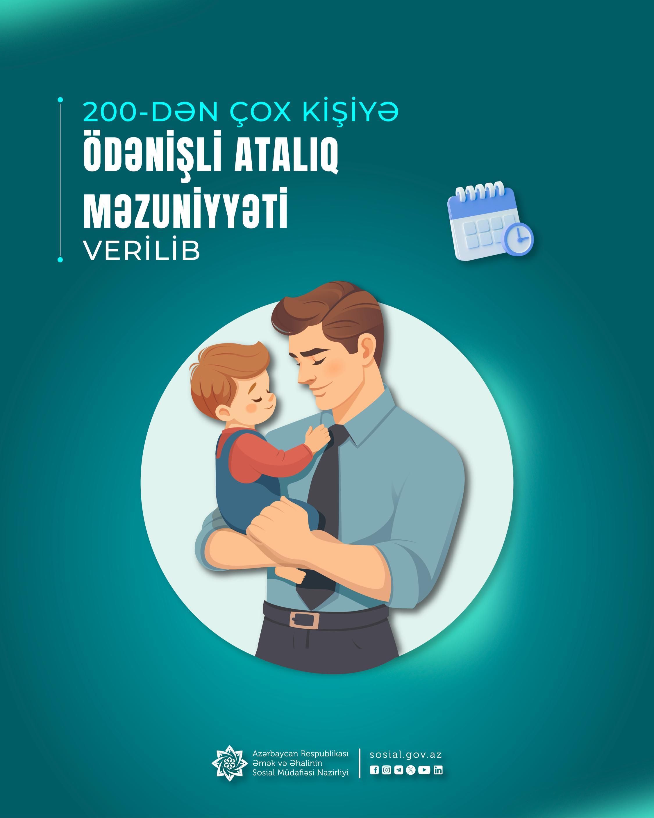 Artıq 103 işəgötürən tərəfindən ümumilikdə 213 işçiyə uşağının doğulması ilə əlaqədar 14 təqvim günü müddətində ödənişli atalıq məzuniyyəti verilib.