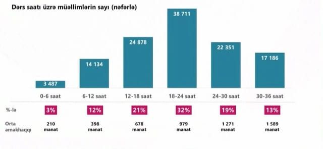 Həmçinin qeyd olunub ki, 38 711 nəfər müəllim ortalama ayda 979 manat maaş alır ki, onların da dərs yükü 18-24 saat aralığında dəyişir.