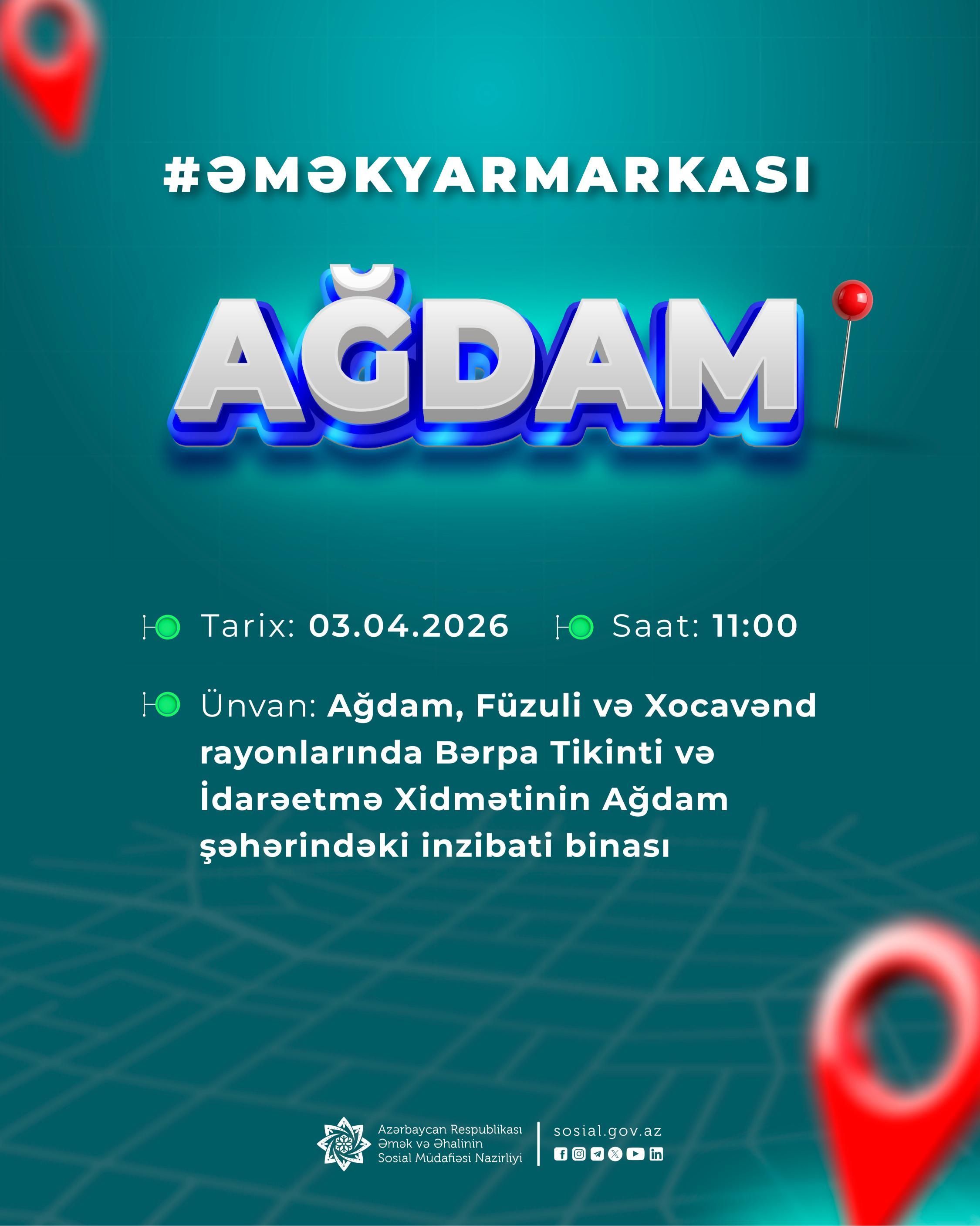 Bakupost.az xəbər verir ki, aktiv məşğulluq tədbiri 3 aprel 2026-cı il tarixində, saat 11:00-da Ağdam, Füzuli və Xocavənd rayonlarında Bərpa Tikinti və İdarəetmə Xidmətinin Ağdam şəhərindəki inzibati binasında keçiriləcək. Yarmarkada dəzgah operatoru üzrə vakansiyalar təqdim olunacaq.