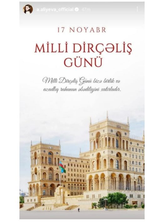 Prezident İlham Əliyevin gəlini Alyona Əliyeva 17 Noyabr - Milli Dirçəliş Günü ilə bağlı paylaşım edib.