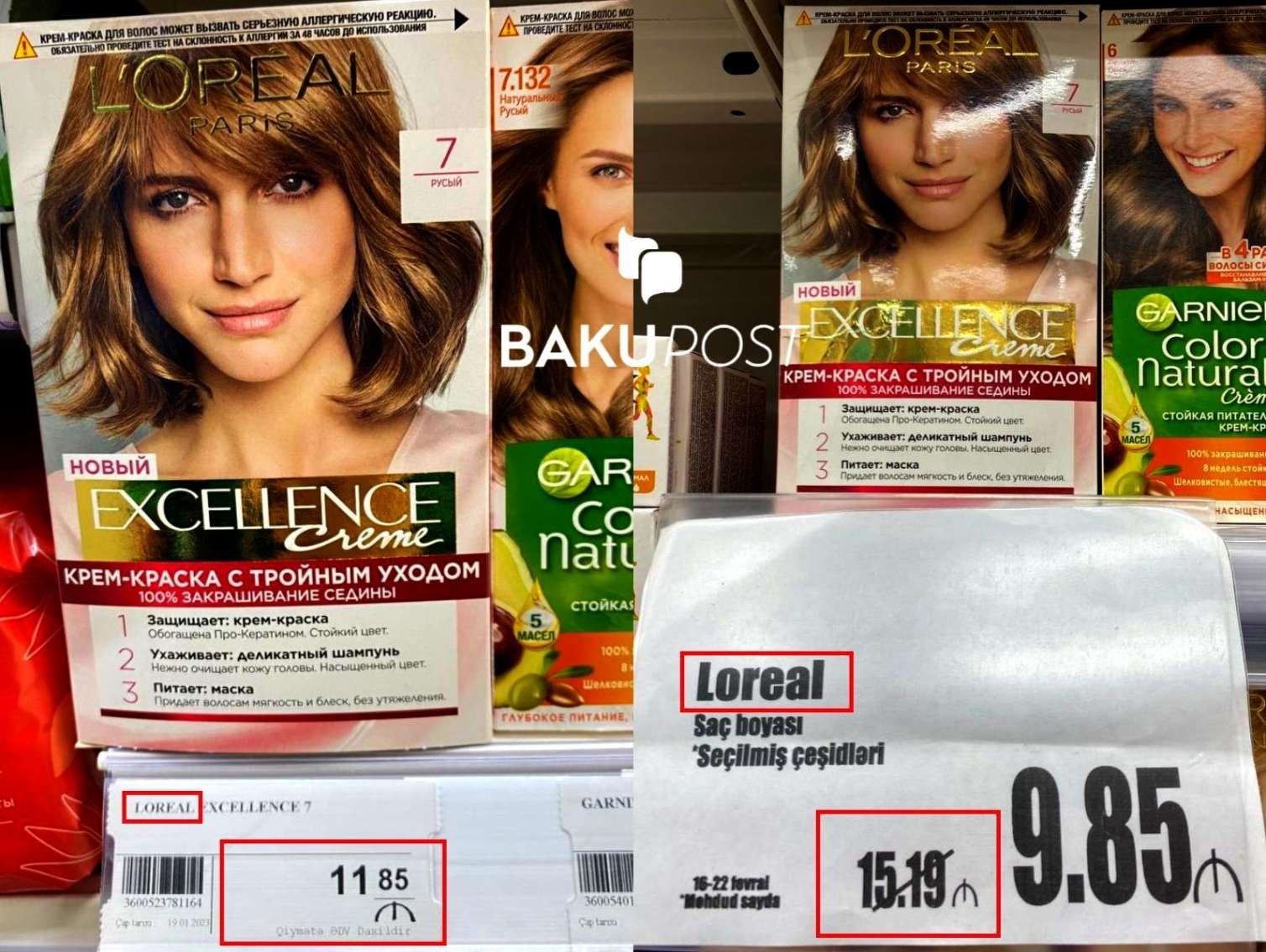 Belə ki, endirim tətbiq edilmiş məhsullardan biri “Loreal excellence creme” saç boyasıdır. Saç boyasının endirimsiz qiyməti 11 manat 85 qəpikdir. Lakin market endirimə qoyarkən boyanın əvvəlki qiymətinin 15 manat 19 qəpik olduğunu qeyd edib.