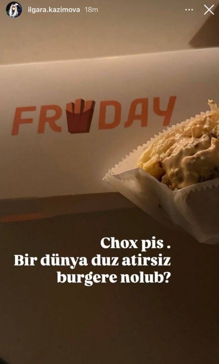 "Çox pis. Bir dünya duz atırsınız burgerə. Nə olub?" deyə, İlqarə paylaşımında bildirib.