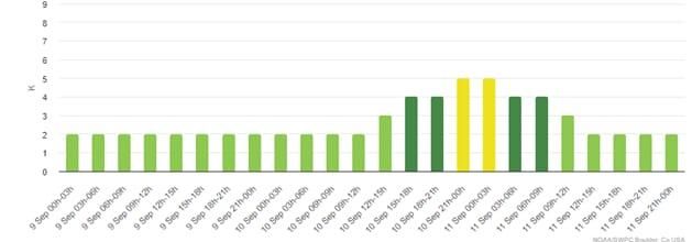 Qeyd olunub ki, hazırda geomaqnit qasırğası orta səviyyədədir: "Sentyabrın 10-u saat 17:00 radələrindən başlayaraq geomaqnit qasırğa G1 (mülayim) səviyyəsinə yüksələcək, sentyabrın 10-u gecə və 11-i səhər saat 06:00 radələrində G2 (orta) səviyyədə olacaq. Sentyabrın 11-i saat 13:00 radələrindən başlayaraq geomaqnit sahə normal fon səviyyəsinə düşəcək. Geomaqnit qasırğa daha çox yüksək coğrafi enliklərdə müşahidə olunacaq. Orta coğrafi enliklərdə isə mülayim olaraq hiss ediləcək".