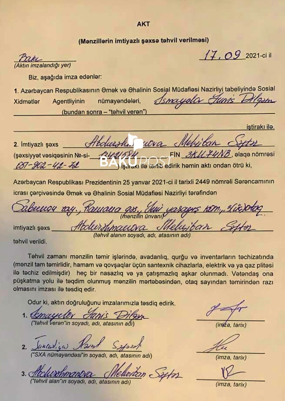 “Abdurəhmanlı Mehriban Səftər qızı 17.09.2021-ci il tarixində Ramana Yeni Yaşayış Kompleksində üçotaqlı mənzillə təmin olunub”.