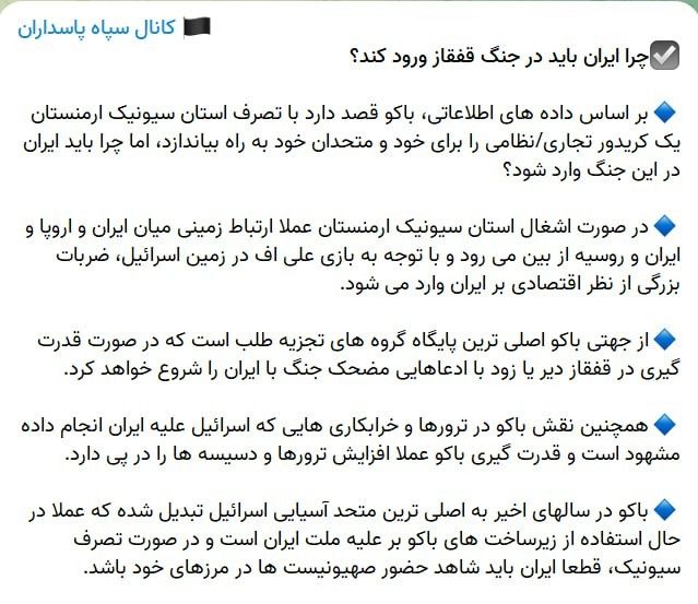 Bakupost.az İran KİV-ə istinadla xəbər verir ki, İslam İnqilabı Keşikçiləri Korpusunun Telegram kanalı bu gün “İran niyə Qafqaz müharibəsinə girməlidir?” başlıqlı məqalə dərc edib.