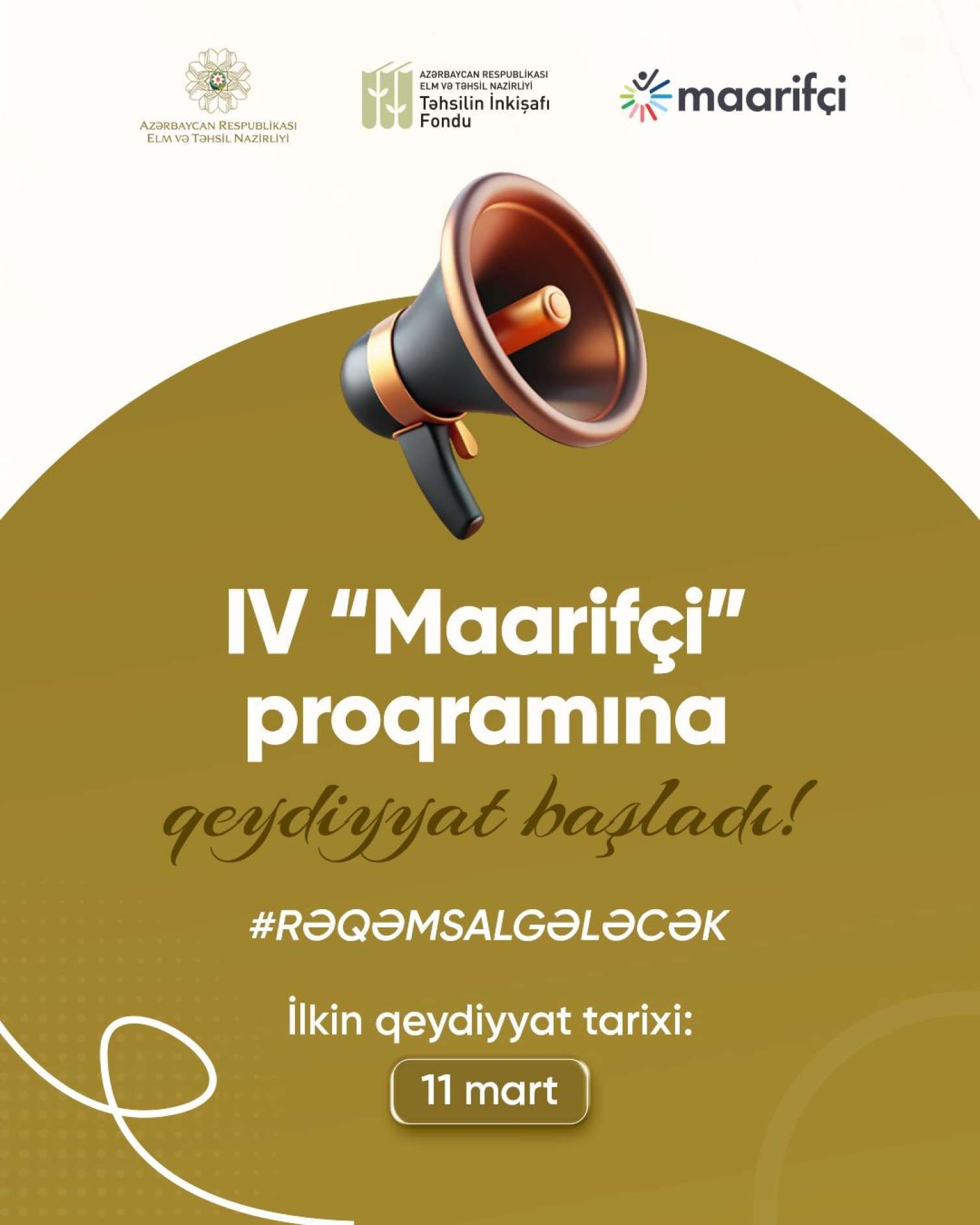 Martın 11-dən Elm və Təhsil Nazirliyinin təşəbbüsü və Təhsilin İnkişafı Fondunun dəstəyi ilə “Maarifçi” tələbə-məzun təcrübə proqramının növbəti – IV mərhələsinə qeydiyyat prosesi başlayır.