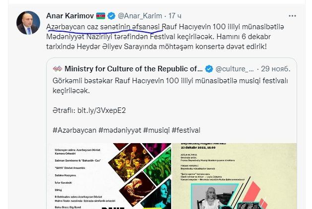 Bakupost.az bildirir ki, nazir öz sosial şəbəkə hesabında görkəmli bəstəkar Rauf Hacıyevin 100 illiyi münasibətilə paylaşım edib.