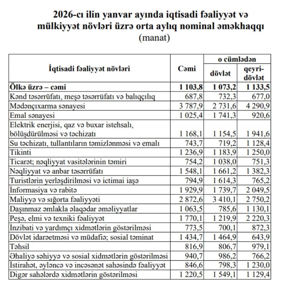 Məlumata görə, mədənçıxarma sənayesində, maliyyə və sığorta fəaliyyəti, informasiya və rabitə, peşə, elmi və texniki fəaliyyət, eləcə də nəqliyyat və anbar təsərrüfatı sahələrində orta aylıq nominal əməkhaqqı ölkə üzrə orta göstəricidən yüksək olub.