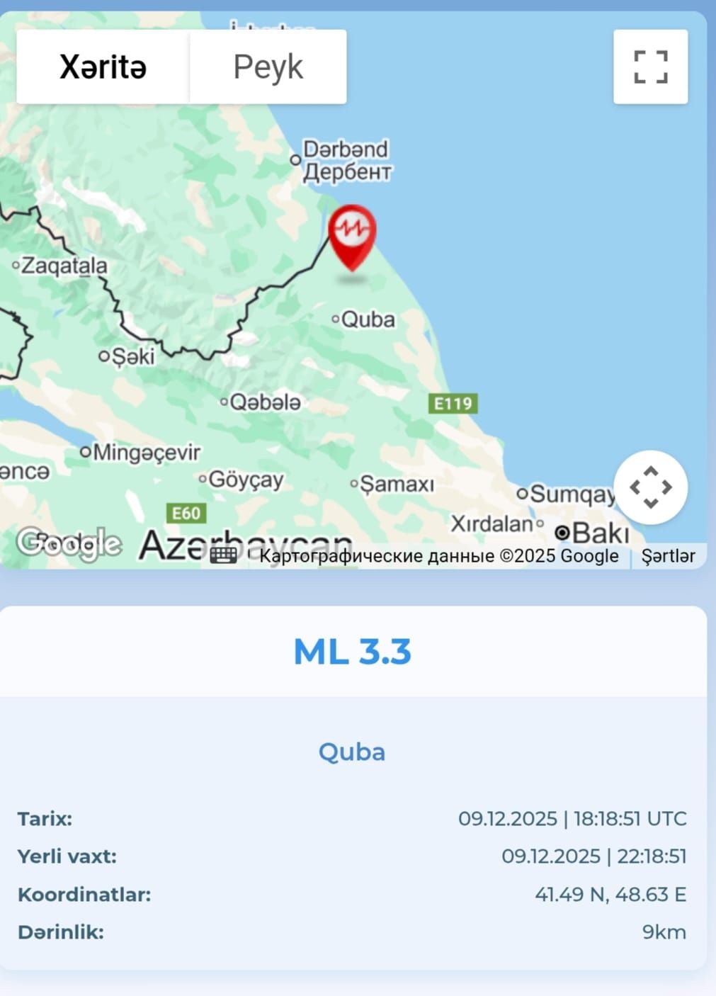 Qeyd olunub ki, yerli vaxtla saat 22:18-də Quba stansiyasından 19 km şimalda 3.3 maqnitudada zəlzələ qeydə alınıb.