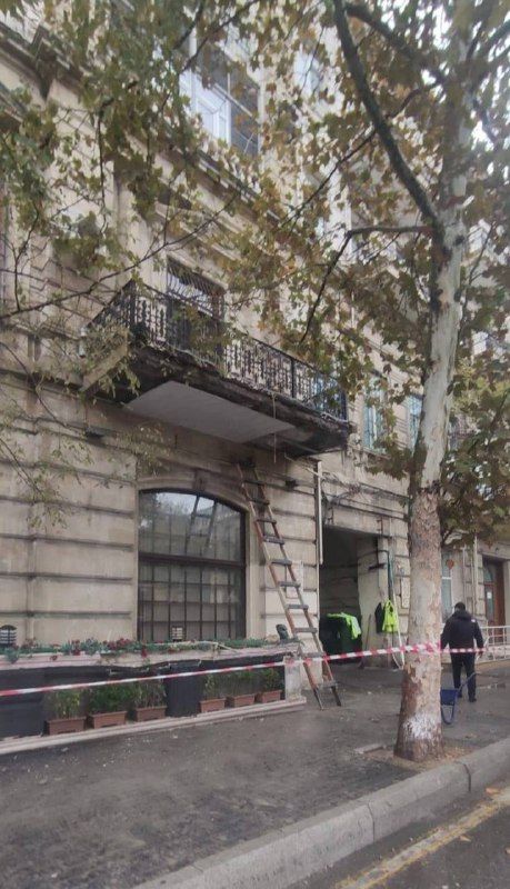 Bakı şəhəri Səbail rayonu Rəşid Behbudov küçəsi 12 ünvanında yerləşən 3320 inventar nömrəli yerli əhəmiyyətli memarlıq abidəsi olan binanın ikinci mərtəbəsində yerləşən mənzilin eyvanı təbii təsirlərdən uçub.
