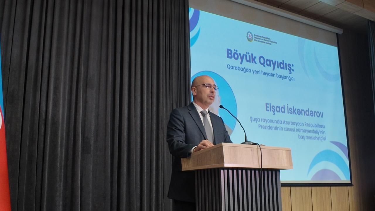 Şuşa rayonunda Azərbaycan Respublikası Prezidentinin xüsusi nümayəndəliyinin rəsmisi Elşad İskəndərov çıxış edərək, Böyük Qayıdışın əhəmiyyətini və bu prosesin gələcək inkişafı barədə, Şuşanın və digər azad edilmiş ərazilərin bərpası üçün həyata keçirilən layihələrin əhəmiyyətini vurğulayıb. Bu layihələrin yalnız infrastruktur sahəsində deyil, həm də əhalinin sosial rifahının yaxşılaşdırılması, mədəniyyətin və təhsilin inkişaf etdirilməsi, eləcə də yeni iş yerlərinin yaradılması istiqamətində böyük rolu olduğunu qeyd edib.