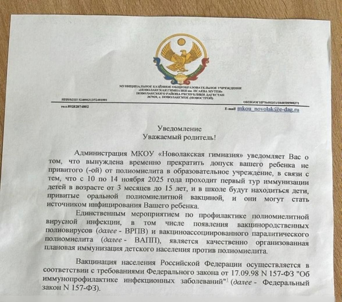 Dağıstanın Novolak rayonunda yerləşən Mutey İsayev adına gimnaziyada poliomielit peyvəndi ətrafında ciddi mübahisə yaranıb. Valideynlərin kütləvi şəkildə peyvənddən imtina etməsindən sonra təxminən 100 şagirdin məktəbə buraxılmadığı bildirilir.