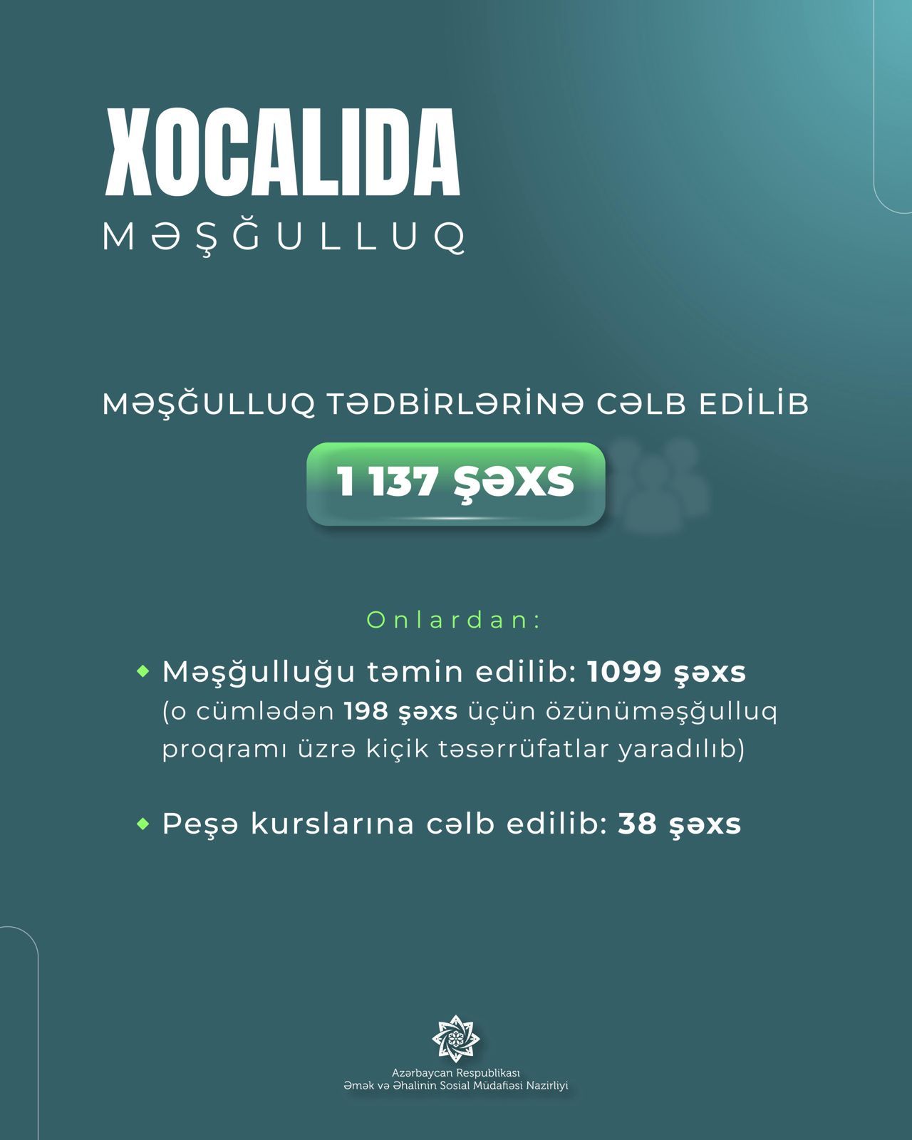 Əmək və Əhalinin Sosial Müdafiəsi Nazirliyinin (ƏƏSMN) tabeliyində Dövlət Məşğulluq Agentliyi Xocalı rayonuna köçürülmüş sakinlərdən artıq 1137 şəxsi məşğulluq tədbirlərinə cəlb edib.