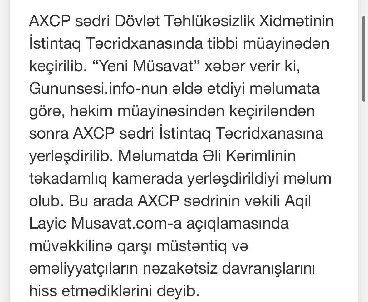 AXCP sədri Əli Kərimlinin vəkili Aqil Layıc müstəntiq və əməliyyatçıların müvəkkilinə davranışı ilə bağlı Müsavat.com-a açıqlama vermədiyini bildirib.