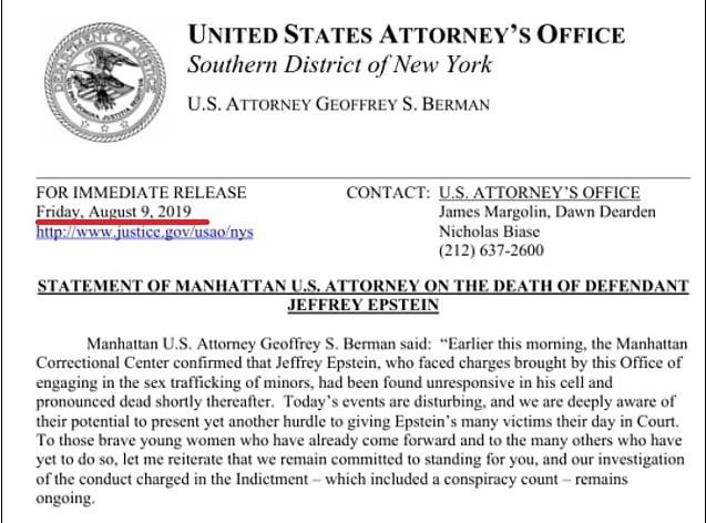 Maraqlısı odur ki, bu sənədin üzərində 9 avqust 2019-cu il tarixi göstərilib. Halbuki rəsmi versiyaya görə, Epşteyn 10 avqust 2019-cu ildə səhər yeməyi gətirən həbsxana əməkdaşı tərəfindən huşsuz vəziyyətdə aşkarlanıb. Cəzaçəkmə müəssisəsinin tibb işçiləri onu həyata qaytarmağa çalışsalar da, nəticə əldə olunmayıb və bir müddət sonra ölümü rəsmi şəkildə qeydə alınıb.