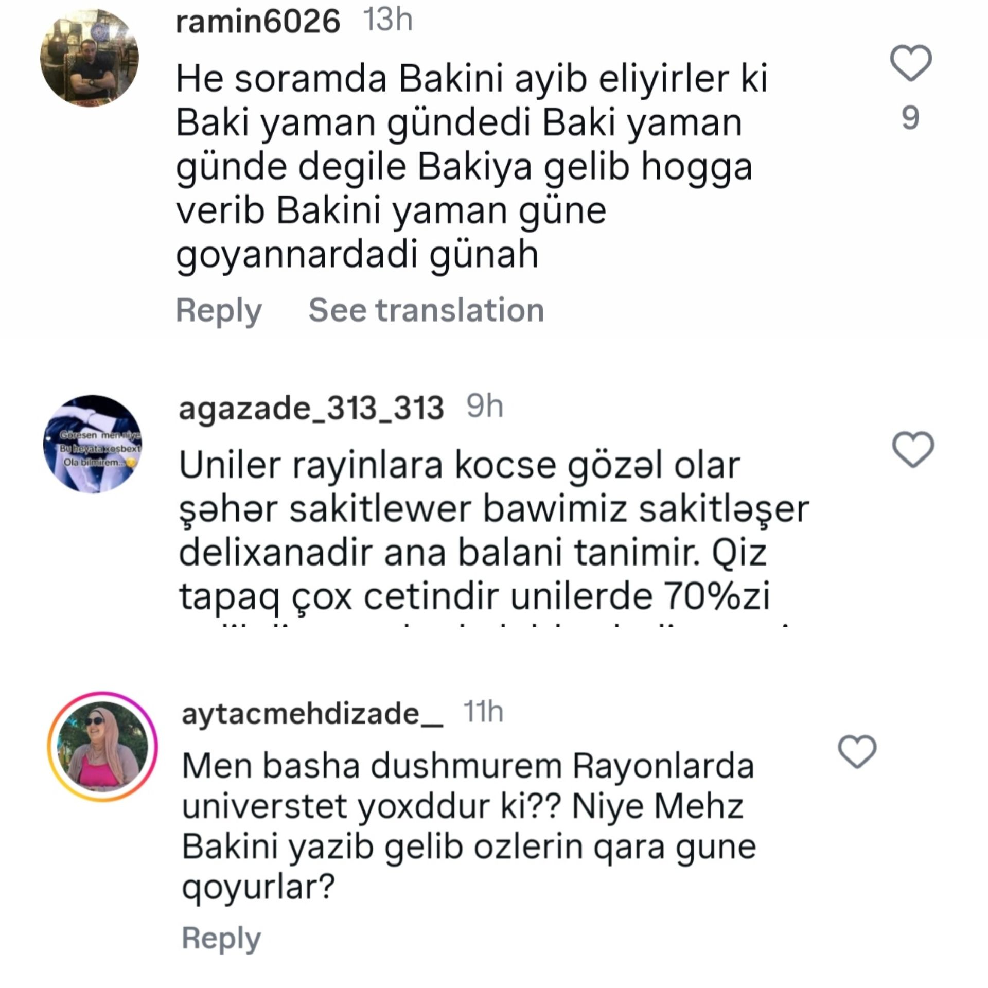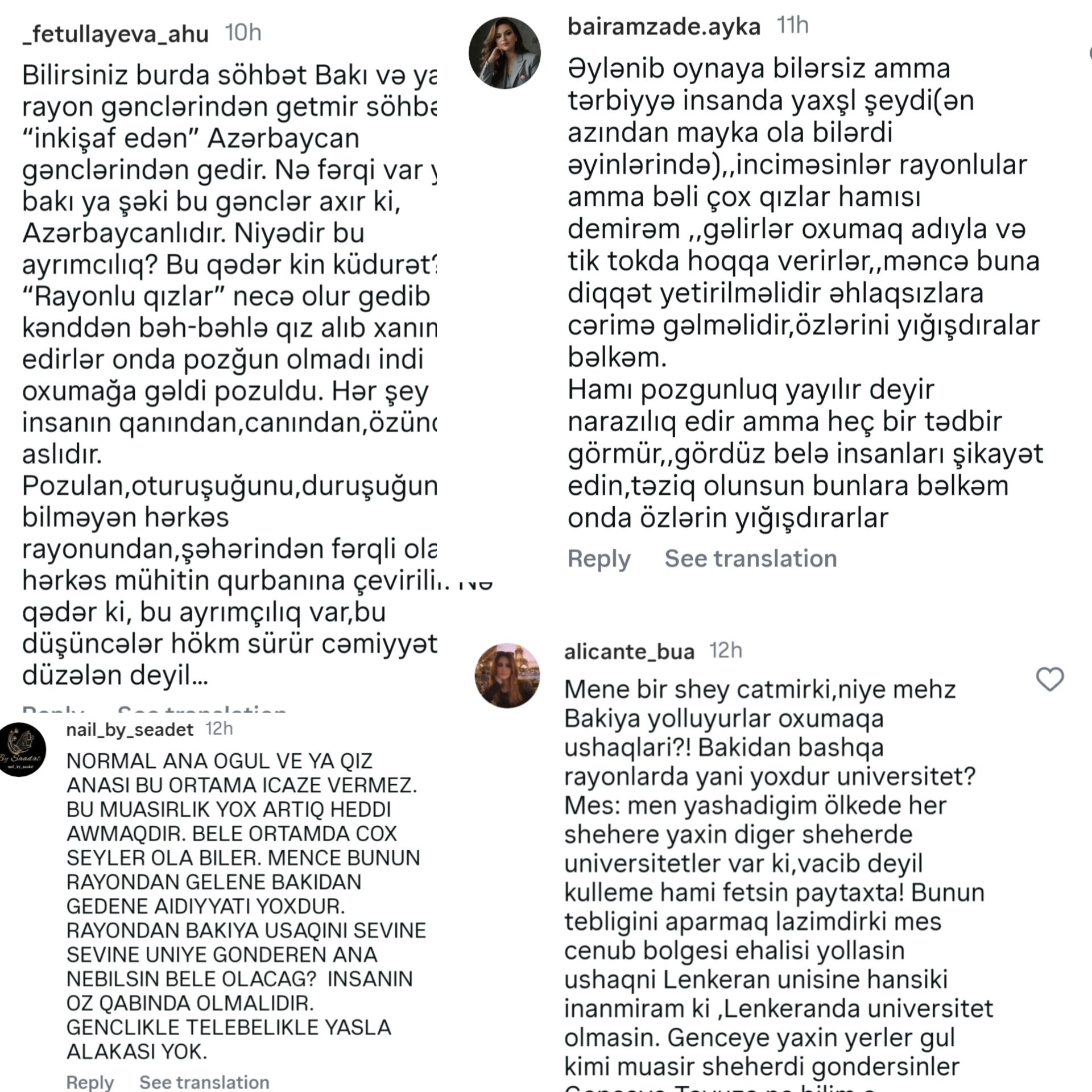 Şərhlərdə bir çox istifadəçilər həmin şəxslərin rayondan gəlib Bakıda təhsil alan tələbələr ola biləcəyini iddia ediblər və bu cür halları gənclərin “sərbəstlik” qazanması ilə əlaqələndiriblər.