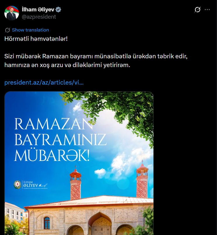 Azərbaycan Respublikasının Prezidenti İham Əliyev sosial media hesablarında Ramazan bayramı münasibətilə paylaşım edilib.