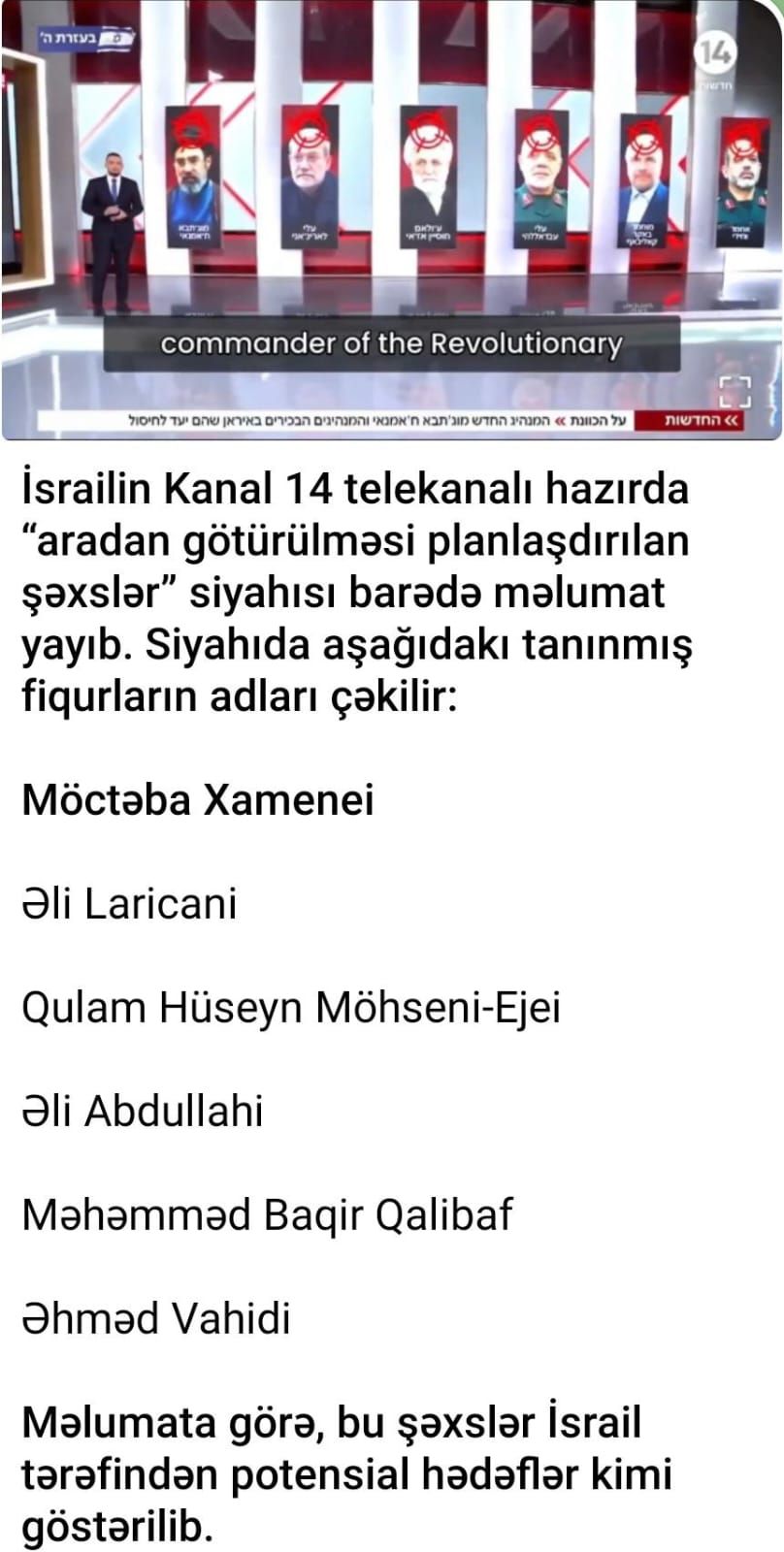 İsrailin “Kanal 14” telekanalı hazırda İranda aradan götürülməsi planlaşdırılan şəxslərin siyahısını yayıb.