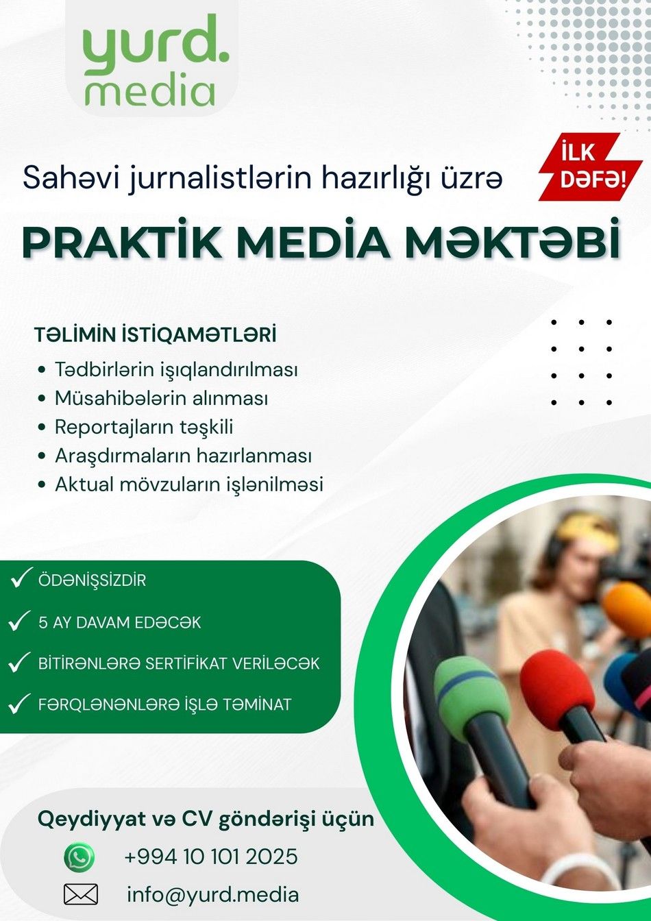 Bu reallığı nəzərə alaraq, Yurd.Media “Praktik Media Məktəbi”nə start verir. Təlimlərə cəlb olunacaq gənclər seçilmiş istiqamət üzrə tədbirlərin işıqlandırılması, müsahibələrin alınması, reportajların təşkili, araşdırmaların hazırlanması, aktual mövzuların işlənilməsi üzrə praktik bacarıqları mənimsəyəcək, həmin sahədə daha dərin biliklərə sahib olmaq üçün istiqamətləndiriləcəklər.