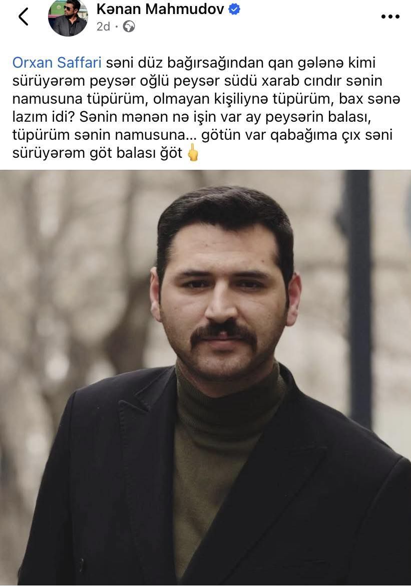 “Kənan M.M.” kimi tanınan Kənan Mahmudovun yazar Orxan Saffariyə qarşı sosial şəbəkədə etdiyi paylaşım geniş müzakirələrə səbəb olub.