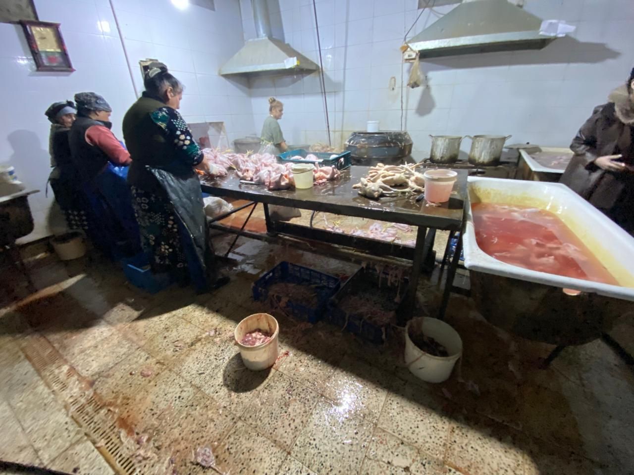 Müəssisə daxilində havalandırma sistemlərinin quraşdırılmaması nəticəsində kondensasiya prosesi zamanı yaranmış suların, o cümlədən yağış sularının tavandan birbaşa qida məhsullarının üzərinə töküldüyü, kəsim prosesində sanitar-gigiyenik tələblərə riayət edilmədiyi, tüklərin təmizlənməsi, pörtlədilməsi, içalatın təmizlənməsinin eyni sahədə həyata keçirildiyi, kəsilmiş toyuqların birbaşa döşəmə üzərinə yığıldığı müəyyən edilib. Eyni zamanda “kənd toyuğu” təəssüratı yaratmaq məqsədilə mənşəyi məlum olmayan rənglərdən istifadə edilərək toyuqların rənglənməsi halları da aşkarlanıb. Sahibkar ev quşlarının bazarlarda satışa çıxarıldığını bildirib.