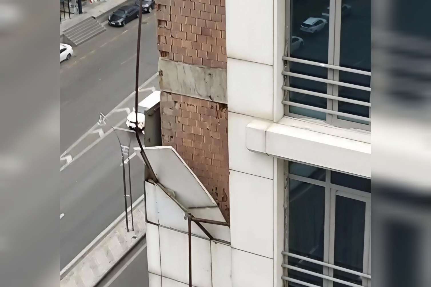 Belə ki, küləyin təsiri nəticəsində biznes mərkəzinin fasadının bir hissəsi qoparaq yerə düşmə riski yaradıb.