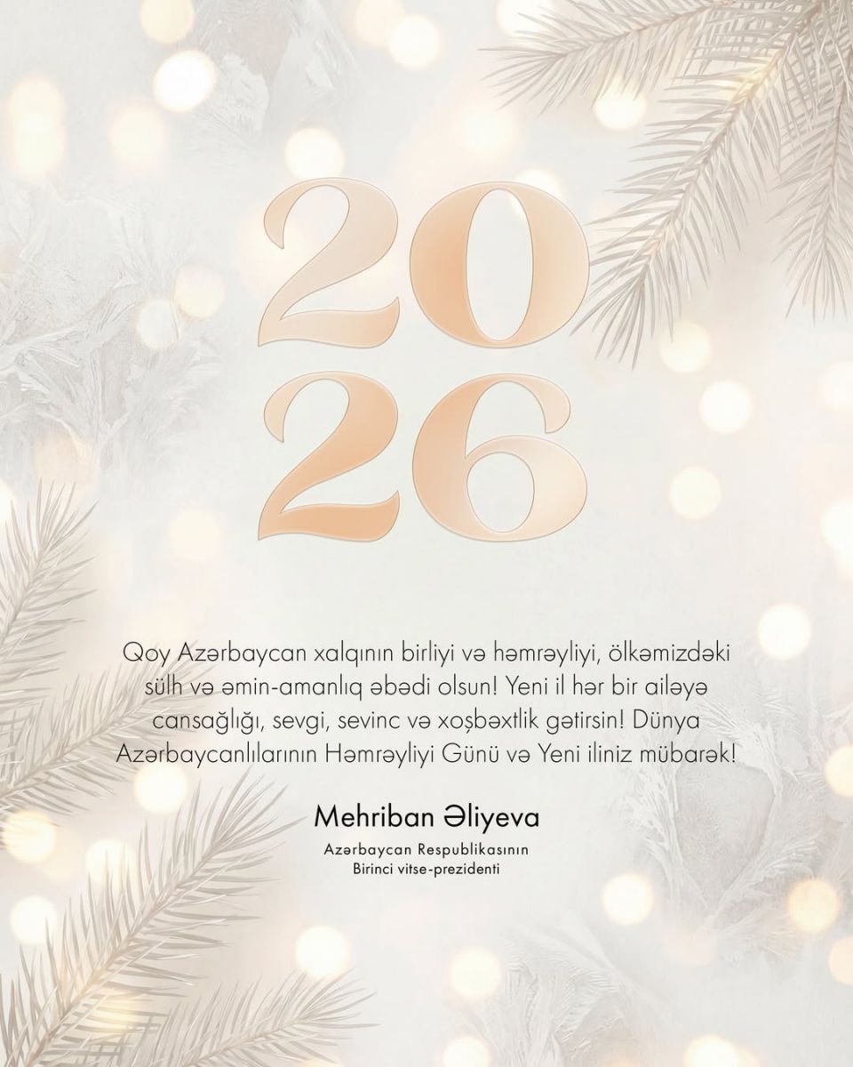 Azərbaycanın Birinci vitse-prezidenti Mehriban Əliyeva sosial şəbəkə hesablarında 31 Dekabr - Dünya Azərbaycanlılarının Həmrəyliyi Günü və Yeni il münasibətilə paylaşım edib.