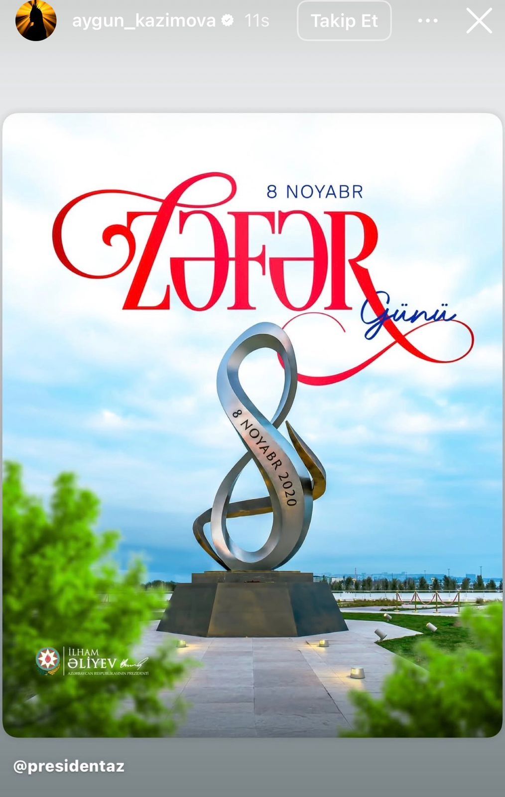 Azərbaycanın tanınmış simaları 8 Noyabr – Zəfər Günü ilə əlaqədar sosial şəbəkə hesablarında paylaşımlar ediblər.