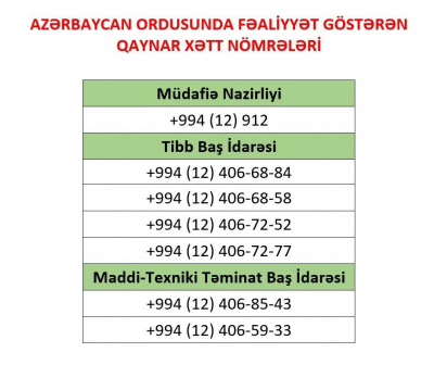 Azərbaycan Müdafiə Nazirliyində fəaliyyət göstərən "Qaynar xətt" telefon nömrələri açıqlanıb.