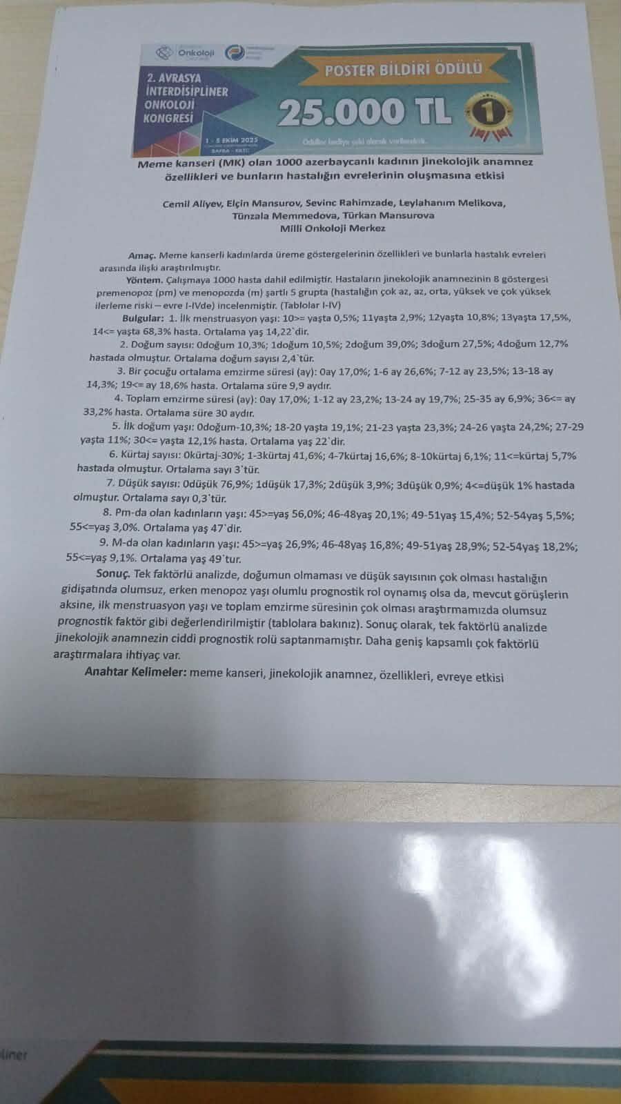 Bakupost.az xəbər verir ki, konfransa təqdim olunan çoxsaylı elmi məqalələr arasında Azərbaycan nümayəndə heyətinin işi birinci yerə layiq görülüb. Qeyd edək ki, elmi araşdırma Milli Onkologiya Mərkəzinin direktoru, professor Cəmil Əliyevin elmi rəhbərliyi ilə aparılıb.