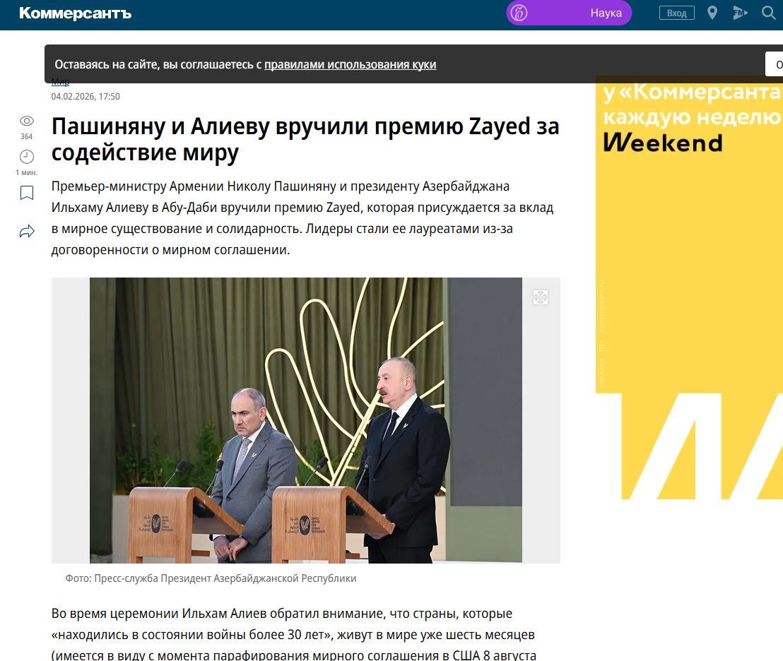 Prezident İlham Əliyevin Əbu-Dabidə “Zayed İnsan Qardaşlığı Mükafatı”na layiq görülməsi və dövlətimizin başçısının çıxışından sitatlar Rusiyanın “Kommersant” qəzeti, “RİA Novosti” agentliyi, “News.ru” portalının materiallarında da yer alıb. Rusiya mətbuatı qeyd edib ki, mərasimdə İlham Əliyev 30 ildən çox müharibə aparan ölkələrin artıq altı aydır ki, sülh şəraitində yaşadıqlarını bildirib (8 avqust 2025-ci ildə ABŞ-da sülh müqaviləsinin paraflanmasına istinad edir). “Dəfələrlə qeyd etdiyim kimi, biz sülh şəraitində yaşamağı öyrənirik. Sizə deyə bilərəm ki, bu, xüsusi bir hissdir. Biz müstəqillik əldə edəndən bəri heç vaxt sülh şəraitində yaşamamışıq və indi bunu sürətlə öyrənirik. ABŞ Prezidenti Donald Trampın Vaşinqtonda ev sahibliyi etdiyi tarixi Zirvə Görüşündən sonrakı altı ay tərəfdaşlıq, əməkdaşlıq və uzunmüddətli, dayanıqlı sülhə doğru irəliləyiş ayları olmuşdur”, - deyə Azərbaycanın lideri vurğulayıb.