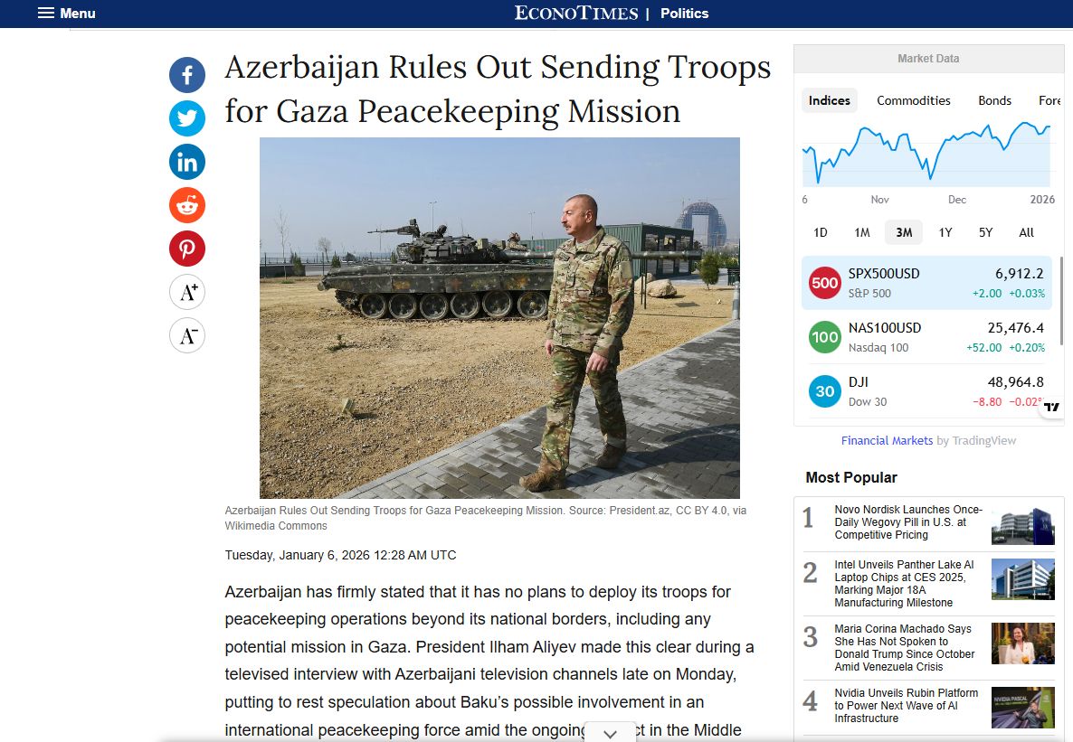 Beynəlxalq iqtisadiyyat portalı “İnvesting.com”, İsrailin “The Jerusalem Post”, “Israelhayom”, “Time of Israel” qəzetləri, rus dilində nəşr olunan “Vesti İzrail” portalı, Bolqarıstanın “Dnevnik” nəşri, Yunanstanın “Skai” internet resursu da Azərbaycan Prezidentinin Yaxın Şərqdə münaqişələrə dair fikirlərini dərc edib. Materiallarda qeyd olunub ki, Prezident İlham Əliyev Qəzza zolağına sülhməramlıların göndərilməsi ilə bağlı yayılan yanlış məlumatları təkzib edib və bu xəbərlərin ilk mənbəyi olan ABŞ tərəfinə diplomatik kanallarla 20 sualdan ibarət müraciət çatdırdığını, həmçinin bununla bağlı təəssüfləndiyini bildirib.