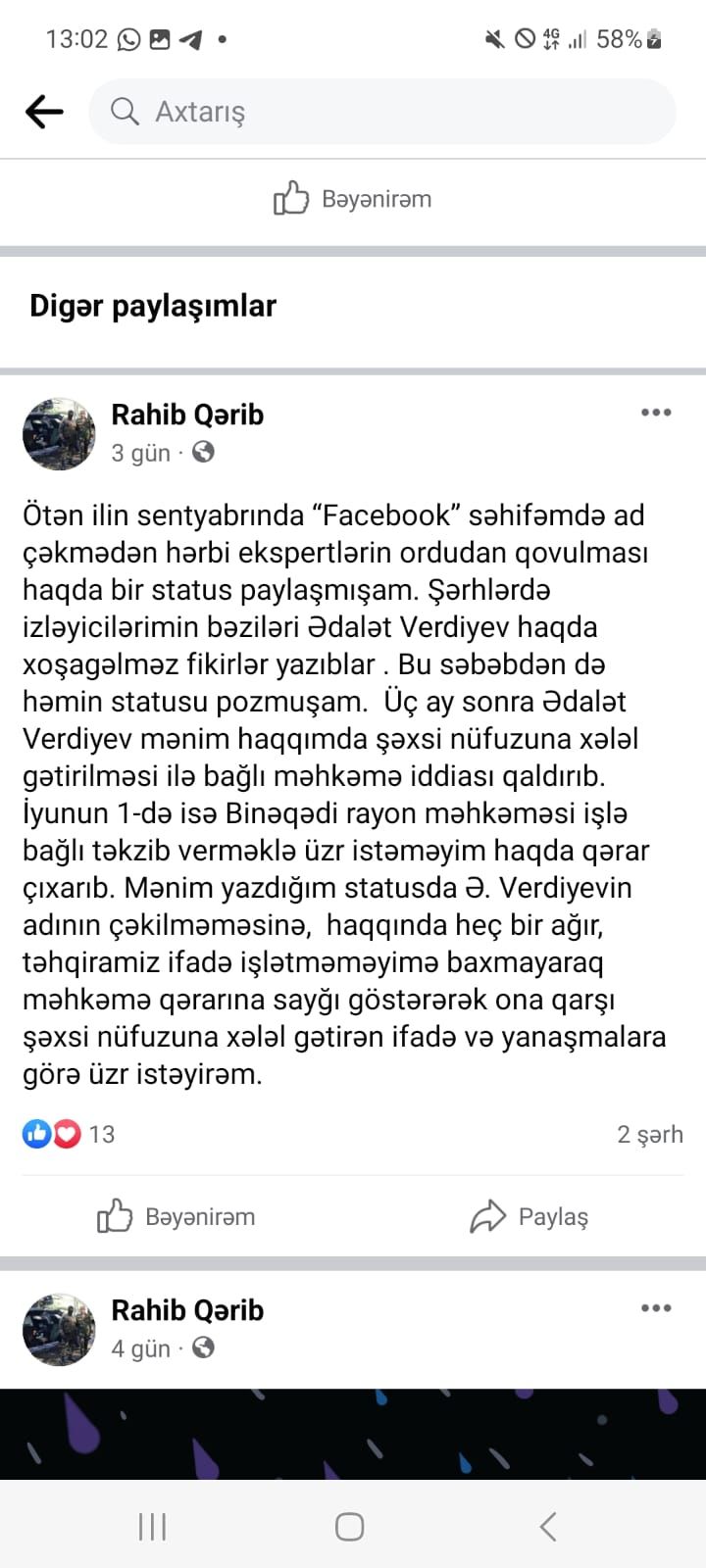 “Ötən ilin sentyabrında “Facebook” səhifəmdə ad çəkmədən hərbi ekspertlərin ordudan qovulması haqda bir status paylaşmışam. Şərhlərdə izləyicilərimin bəziləri Ədalət Verdiyev haqda xoşagəlməz fikirlər yazıblar . Bu səbəbdən də həmin statusu pozmuşam. Üç ay sonra Ədalət Verdiyev mənim haqqımda şəxsi nüfuzuna xələl gətirilməsi ilə bağlı məhkəmə iddiası qaldırıb. İyunun 1-də isə Binəqədi rayon məhkəməsi işlə bağlı təkzib verməklə üzr istəməyim haqda qərar çıxarıb. Mənim yazdığım statusda Ə. Verdiyevin adının çəkilməməsinə, haqqında heç bir ağır, təhqiramiz ifadə işlətməməyimə baxmayaraq məhkəmə qərarına sayğı göstərərək ona qarşı şəxsi nüfuzuna xələl gətirən ifadə və yanaşmalara görə üzr istəyirəm”.