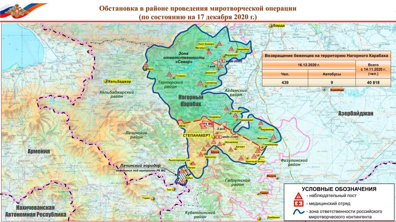 Rusiya Müdafiə Nazirliyi Qarabağda sülhməramlıların yerləşdirilməsinin 17 dekabrda yeni xəritəsini dərc edib. Əvvəlki xəritə 15 dekabr tarixində yayımlanmışdı.