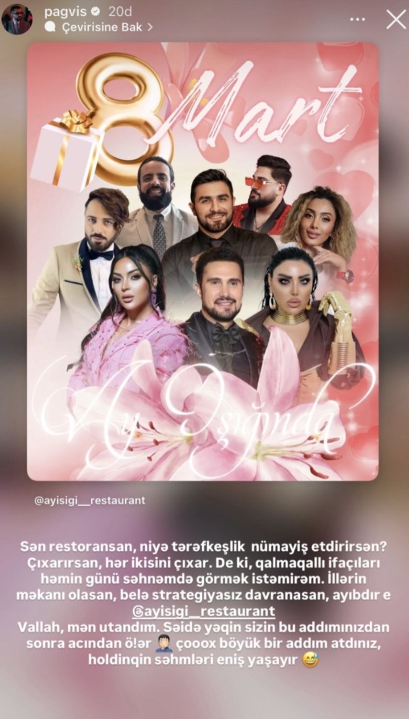 “Sən restoransan, niyə tərəfkeşlik nümayiş etdirirsən? Çıxarırsansa, hər ikisini çıxar. De ki, qalmaqallı ifaçıları həmin gün səhnəmdə görmək istəmirəm. İllərin məkanı olasan, belə strategiyasız davranasan, ayıbdır e.