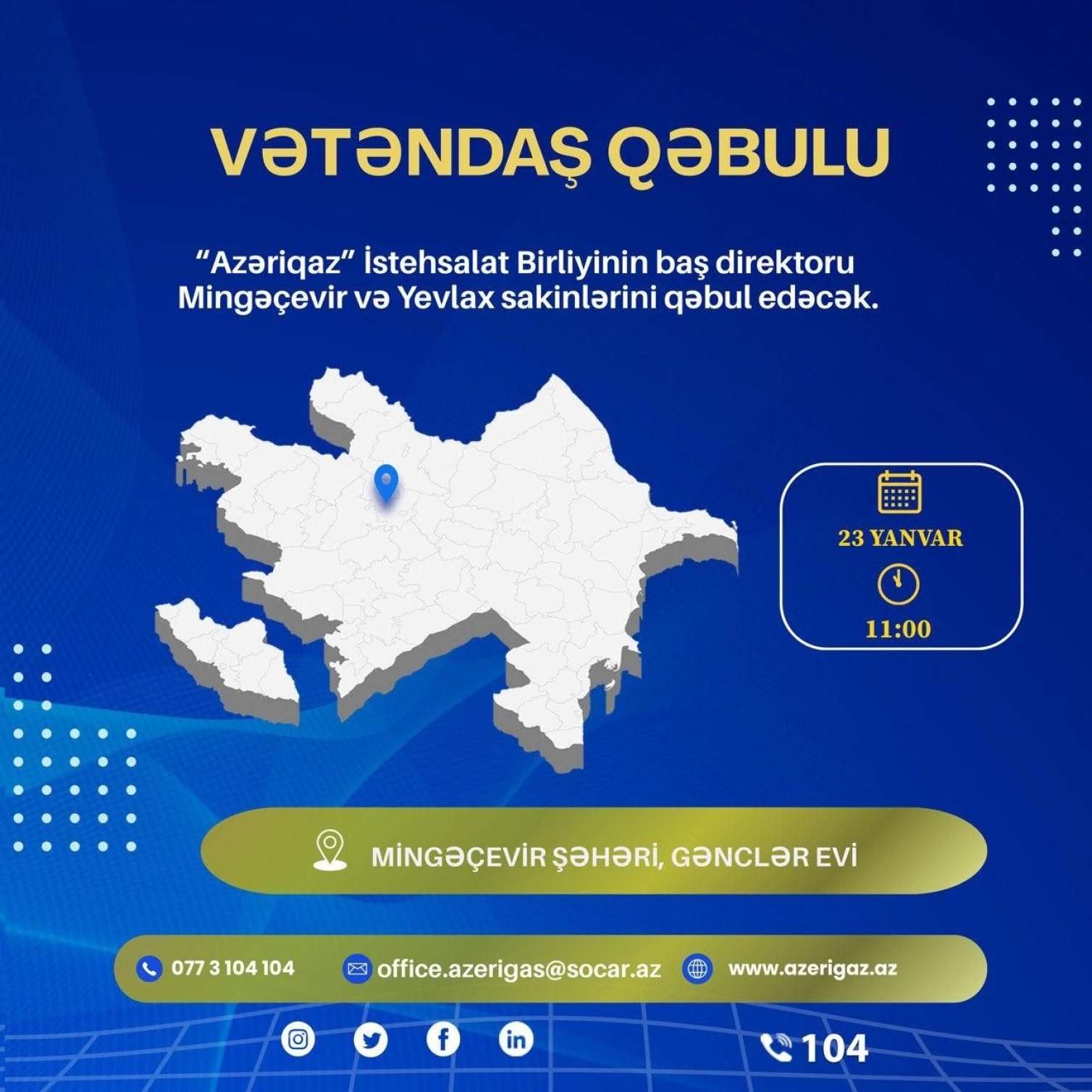 SOCAR-ın “Azəriqaz” İB-nin baş direktorunun Mingəçevir şəhərində vətəndaş qəbulu 23 yanvar saat 11:00-da Gənclər Evində baş tutacaq.