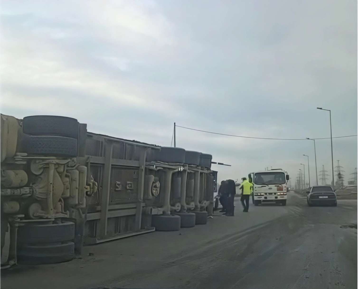 Bakupost.az xəbər verir ki, ağır tonnajlı yük maşını dönən zaman yolun kənarına aşıb.