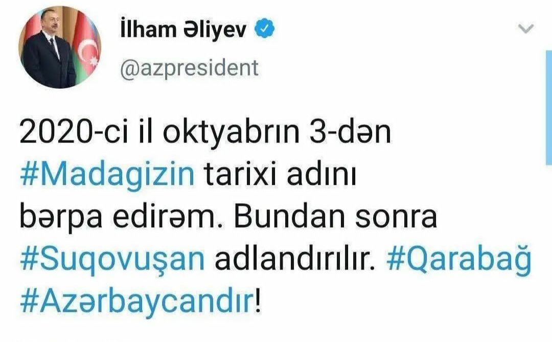 Oktyabrın 3-də Azərbaycan Respublikasının Prezidenti İlham Əliyevin Sərəncamı ilə Madagizin tarixi adı - Suqovuşan adı bərpa olunub.