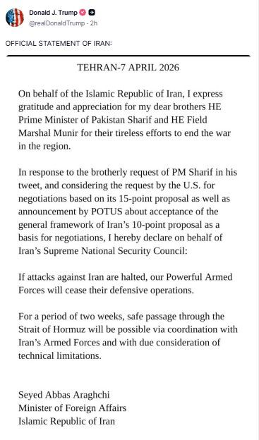 Bakupost.az xəbər verir ki, ABŞ lideri “Truth” sosial şəbəkəsində İran xarici işlər naziri Abbas Araqçının ölkəsinin gərginliyin azaldılması şərtlərini əks etdirən postunu paylaşıb.