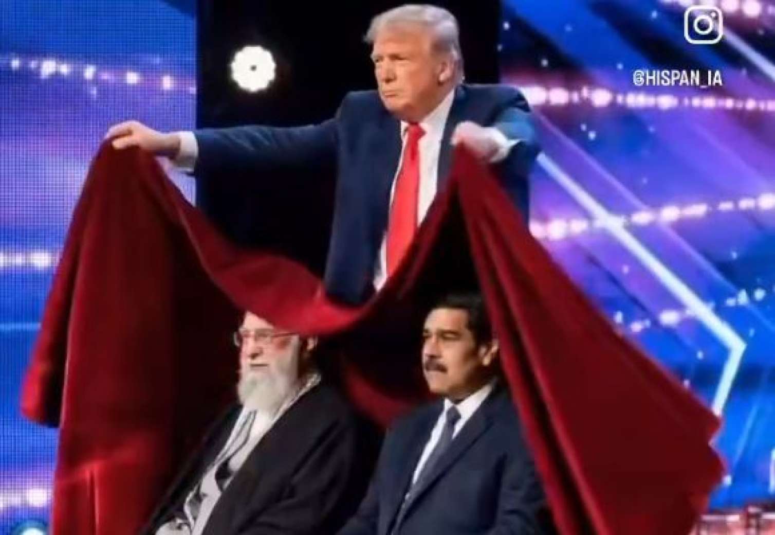Səhnədə dramatik anlar yaşanır. Donald Tramp stulda yanında oturan İran lideri Əli Xamenei və Venesuela prezidenti Nikollas Maduronun üzərinə qırmızı örtük salır və bir ani hərəkətlə onları “yox edir”. Tamaşaçılar arasında oturan İtaliya dövlət başçısı Corca Meloni, Argentina prezidenti Mileyi və İsrail baş naziri Benjamin Netanyahu isə ayağa qalxaraq bunu heyrət içində alqışlayırlar.