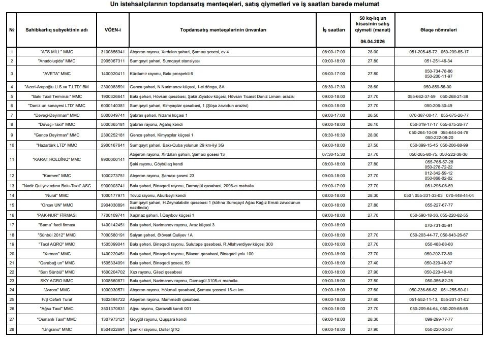 6 aprel tarixinə Azərbaycanda un istehsalçılarının topdansatış məntəqələrində 50 kq-lıq un kisəsinin satış qiyməti 26,1-28,6 manat arasında dəyişib.