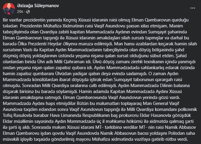Bakupost.az xəbər verir ki, bunu Milli Qvardiyanın keçmiş komandiri, ehtiyatda olan polkovnik Əzizağa Süleymanov sosial şəbəkə hesabında yazıb.