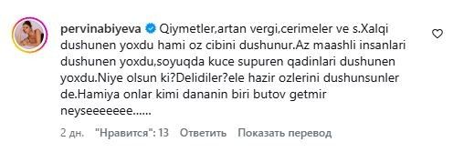 "Qiymətlər, artan vergi, cərimələr və sair... Xalqi düşünən yoxdur, hamı öz cibini düşünür. Az maaş alan insanları, soyuqda küçə süpürən qadınları düşünən yoxdur. Niyə olsun ki... Dəlidilər? Elə hazır özlərini düşünsünlər də... Hamıya onlar kimi dananın biri bütöv getmir ki".