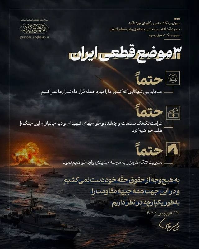 İran İslam Respublikasının ali rəhbəri Müctəba Xamenei "üçüncü məcburi müharibə" adlandırılan məsələyə dair bir sıra prinsipial mövqelərini açıqlayıb.