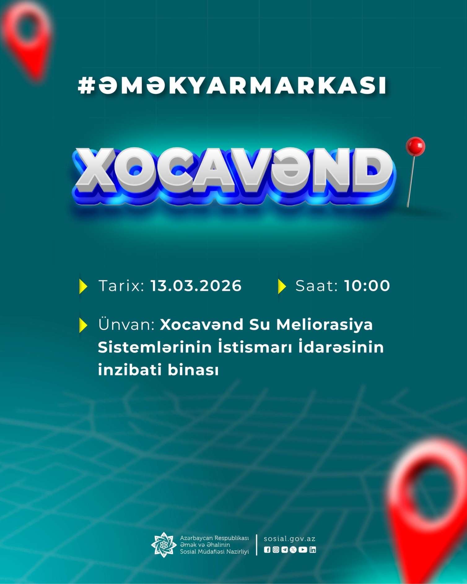 Əmək və Əhalinin Sosial Müdafiəsi Nazirliyinin tabeliyində Dövlət Məşğulluq Agentliyi və SOCAR-ın Qaz İxrac İdarəsinin birgə təşkilatçılığı ilə Xocavənd şəhərində əmək yarmarkası keçiriləcək.