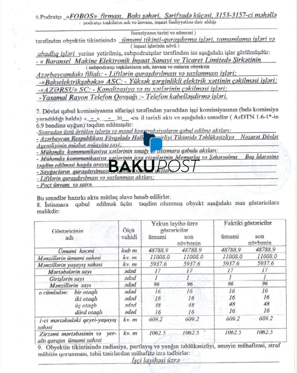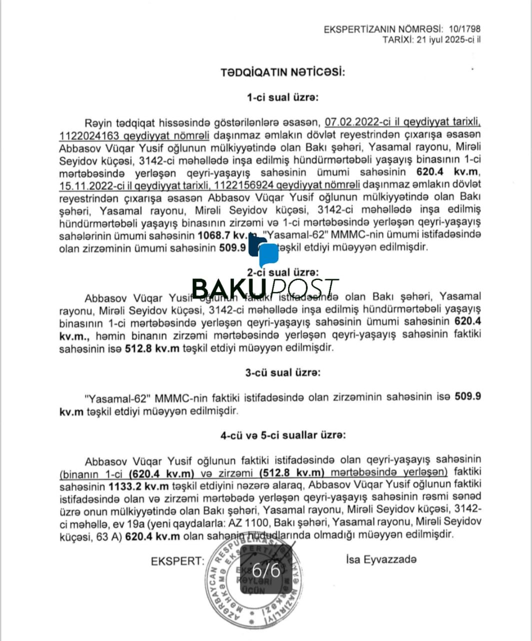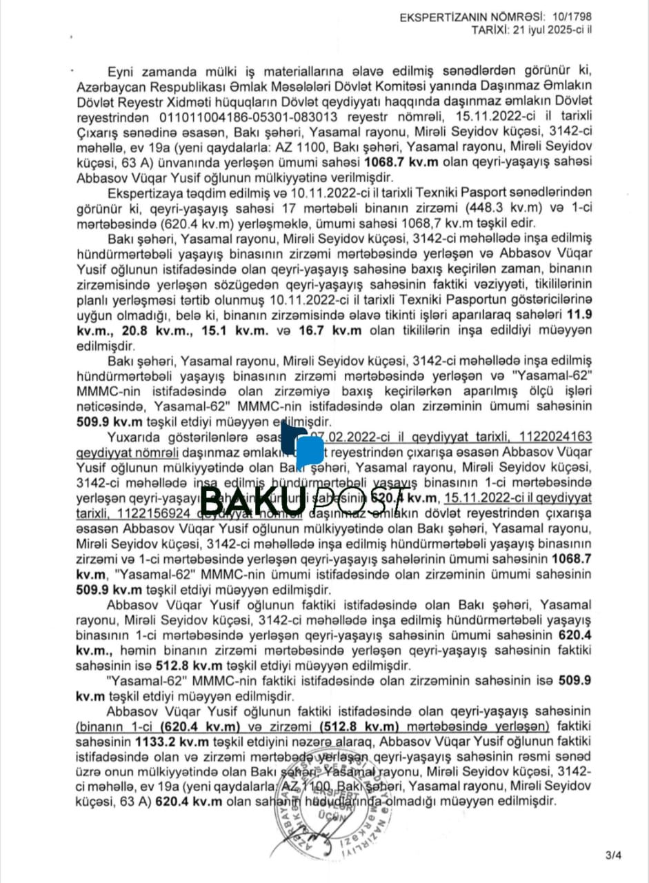 “Binanın istismara qəbul aktında və tikinti layihəsində -1 mərtəbə yalnız zirzəmi və qarajlar üçün nəzərdə tutulub. Bu, həmin sahənin ümumi istifadə və texniki təyinat üçün nəzərdə tutulduğunu təsdiqləyir. Heç bir sənəddə bu mərtəbənin qeyri-yaşayış sahəsi kimi ayrılmasına və ya fərdi mülkiyyətə verilməsinə dair qeyd yoxdur.