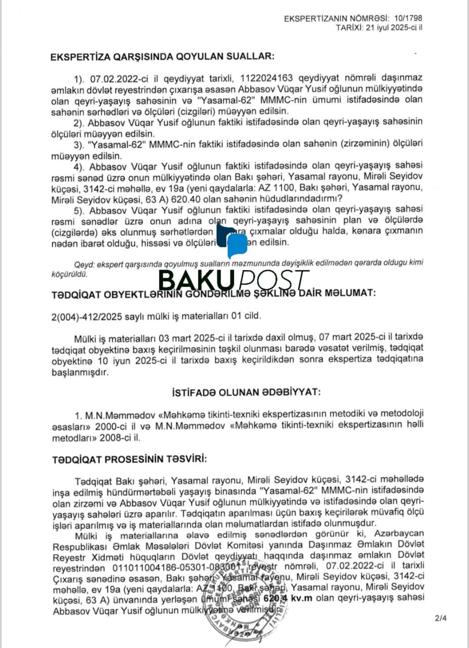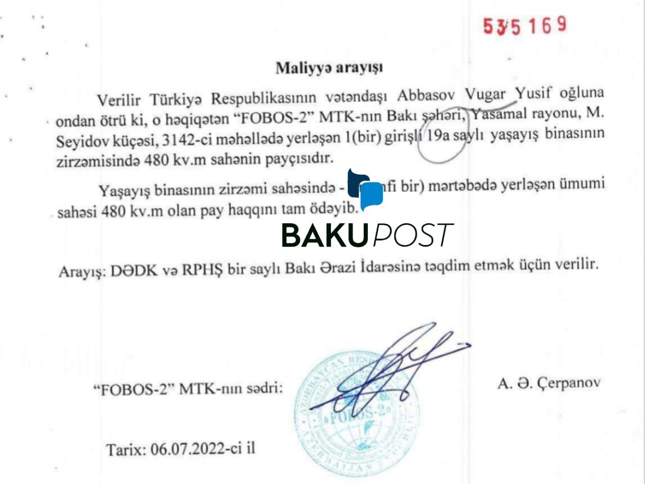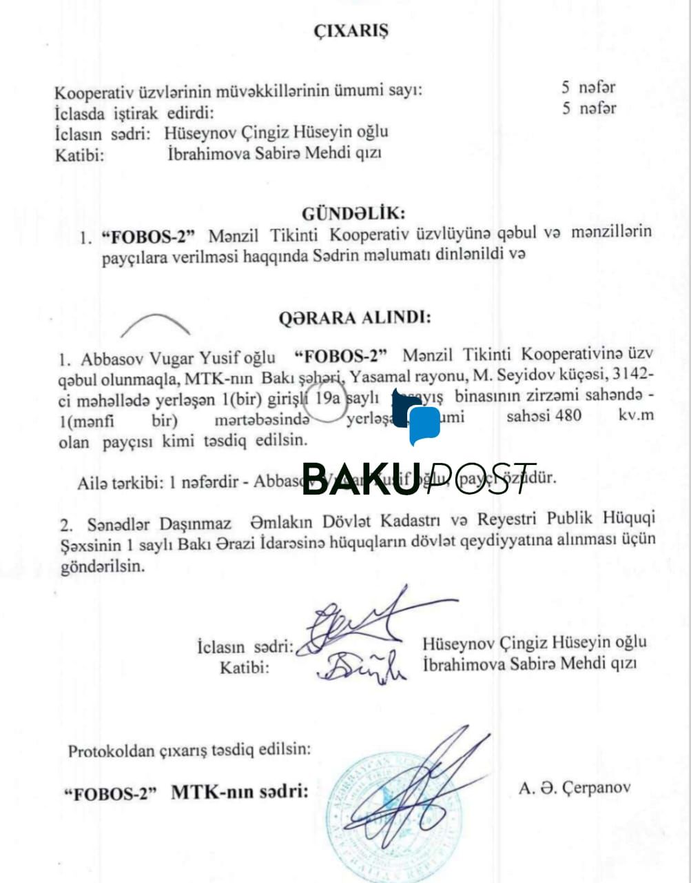 Əmlak Məsələləri Dövlət Xidmətinin məlumatına əsasən, zirzəmi sahəsinin Vüqar Abbasovun adına rəsmiləşdirilməsi aşağıdakı iki sənəd əsasında aparılıb: 1.MTK iclasının protokolundan çıxarışı, 2.Maliyyə arayışı