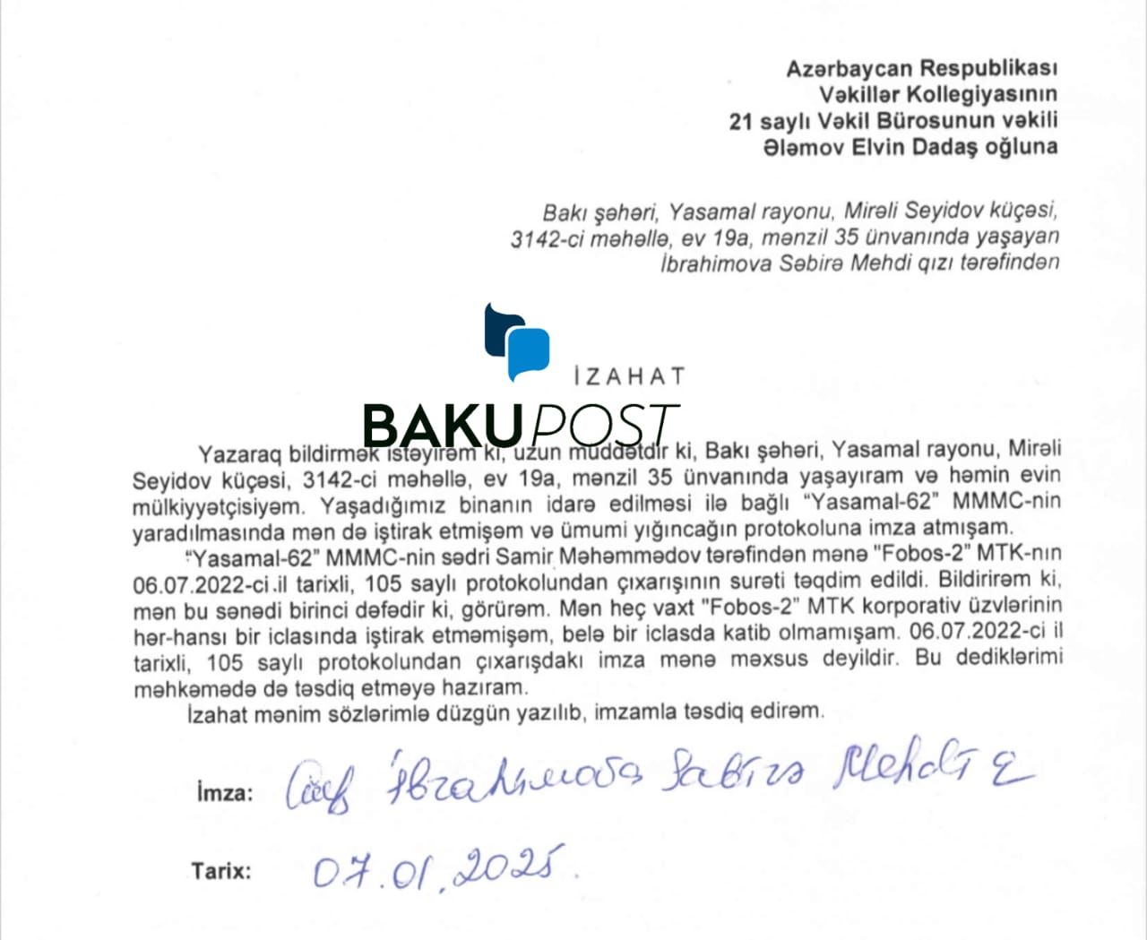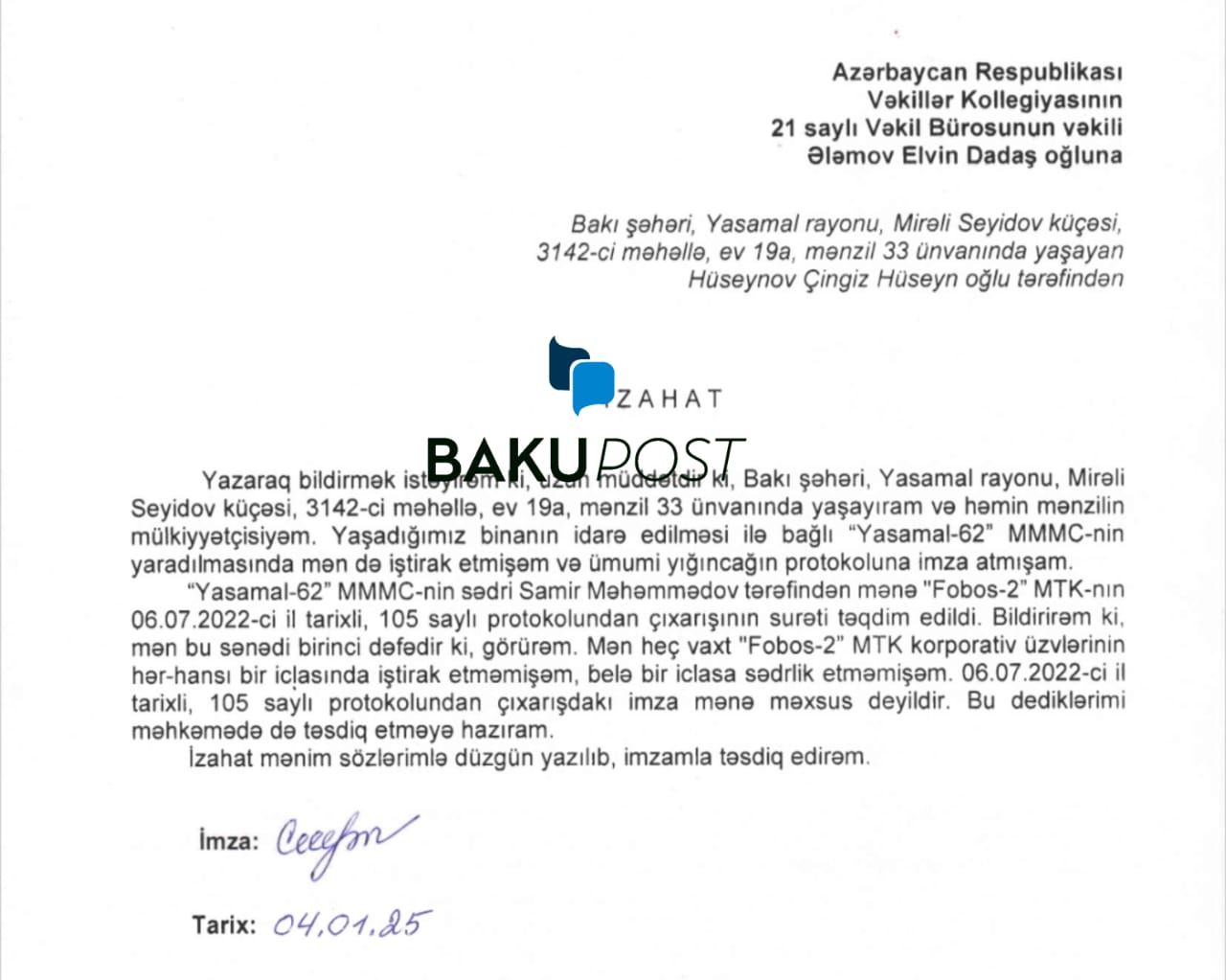“Mən cəmiyyətin idarə heyətinin sədriyəm. Həm də binanın sakiniyəm”.