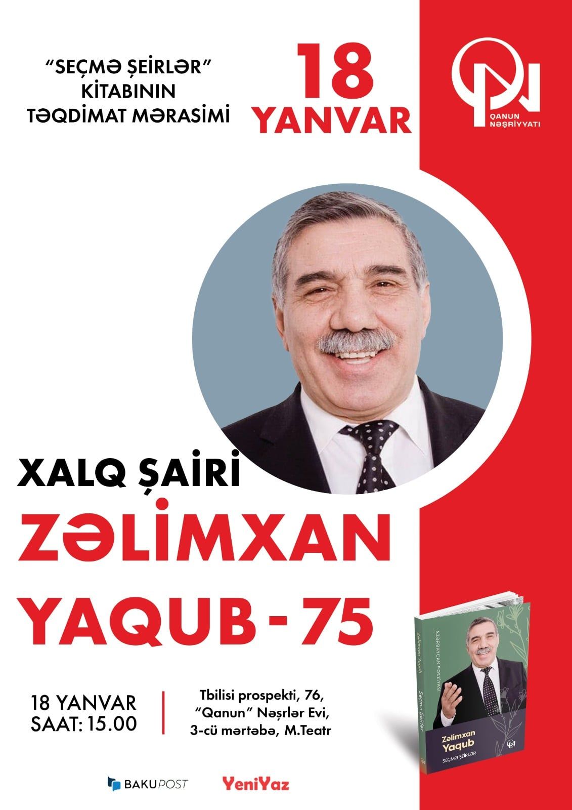 Yanvarın 18-də “Qanun” nəşriyyatında Xalq şairi Zəlimxan Yaqubun yenicə çapdan çıxmış “Azərbaycan poeziyası. Seçmə şeirlər” kitabının təqdimatı olacaq.